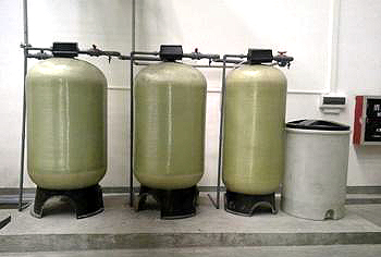 該產(chǎn)品是采用強(qiáng)酸性苯乙烯系鈉型樹脂(NaR)將原水中的硬度成分Ca2+、Mg2+置換出去,使原水得到軟化,其反應(yīng)為:2NaR+Ca2+(Mg2+)=R2Ca(Mg)+2Na+。當(dāng)樹脂置換到一定量的鈣、鎂后,就會(huì)失去置換能力;可以用一定濃度的鹽水浸泡,使其恢復(fù)交換能力,其反應(yīng)式為:R2Ca(Mg)+2Na+=2NaR+Ca2+(Mg2+)。再生過(guò)程包括:反洗(松動(dòng)樹脂層)—吸鹽慢洗(置換過(guò)程)—正洗(將鈣、鎂離子沖掉)—注水(為下次再生準(zhǔn)備)。